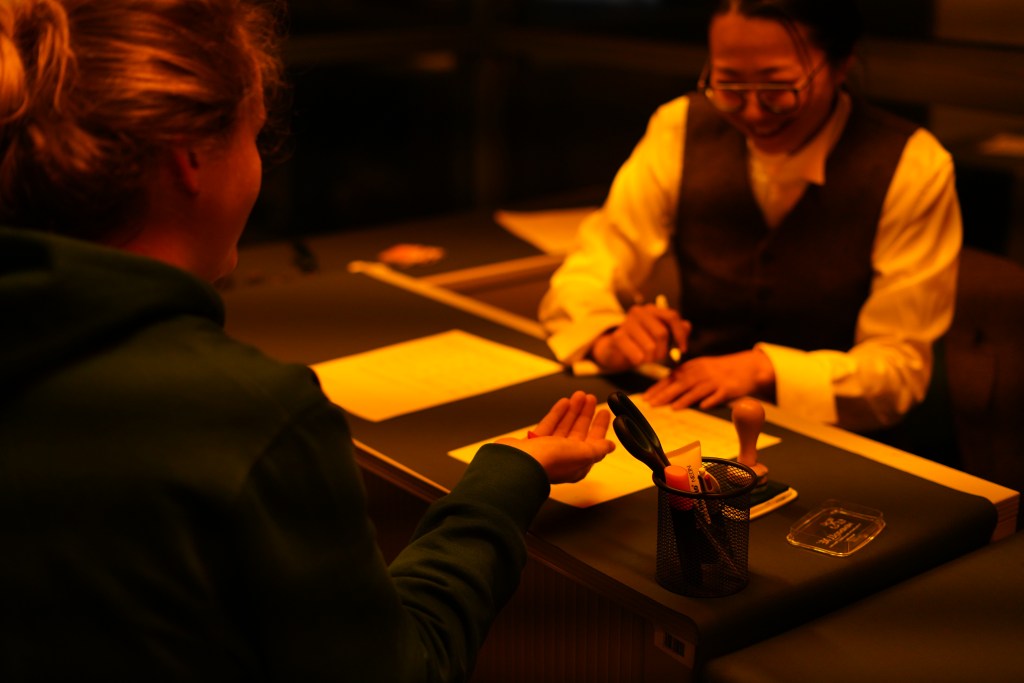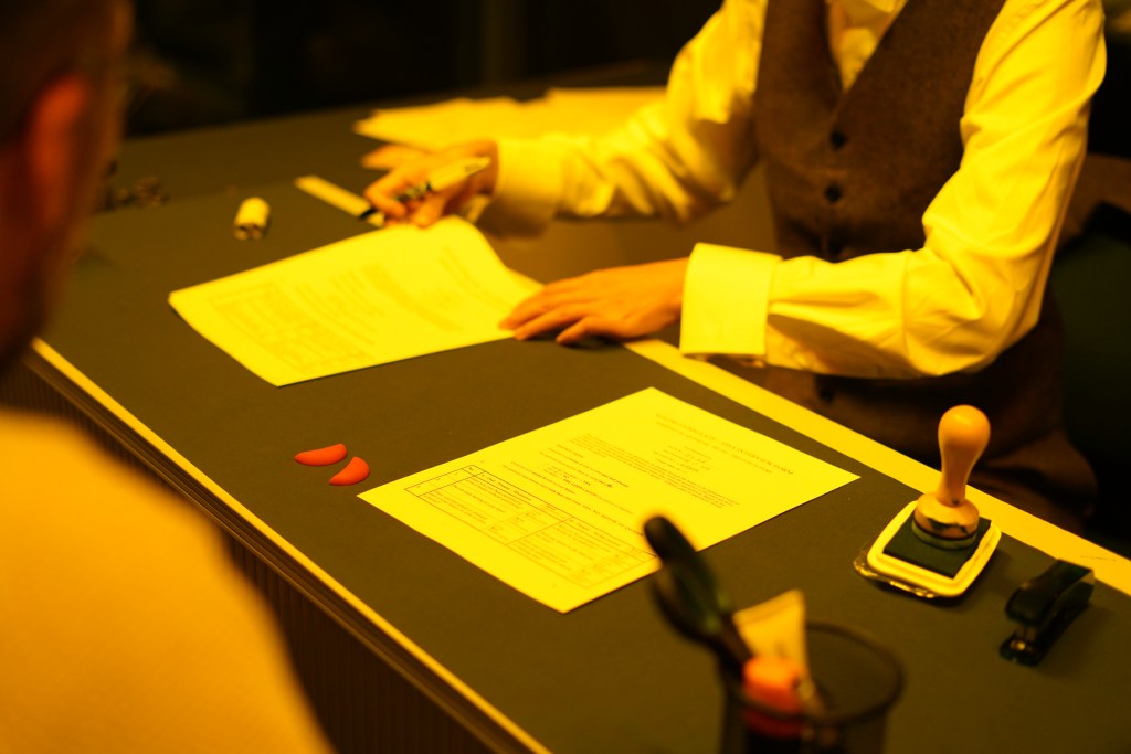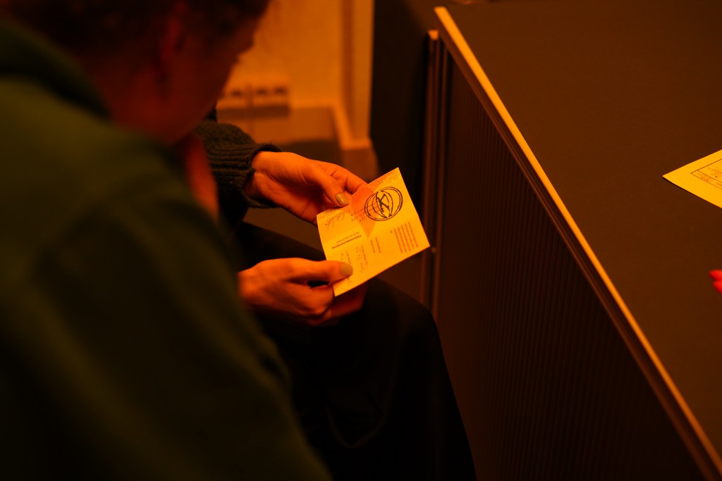 Questions about the past and present are decided through jiao (掷筊) divination, while questions about the future must be answered in the participant’s own voice. Their responses are written down on bureaucratic forms and each interview ends with a stamped Fiktionsbescheinigung that can temporarily replace their identity and assigns a fictional file number as a new ID.