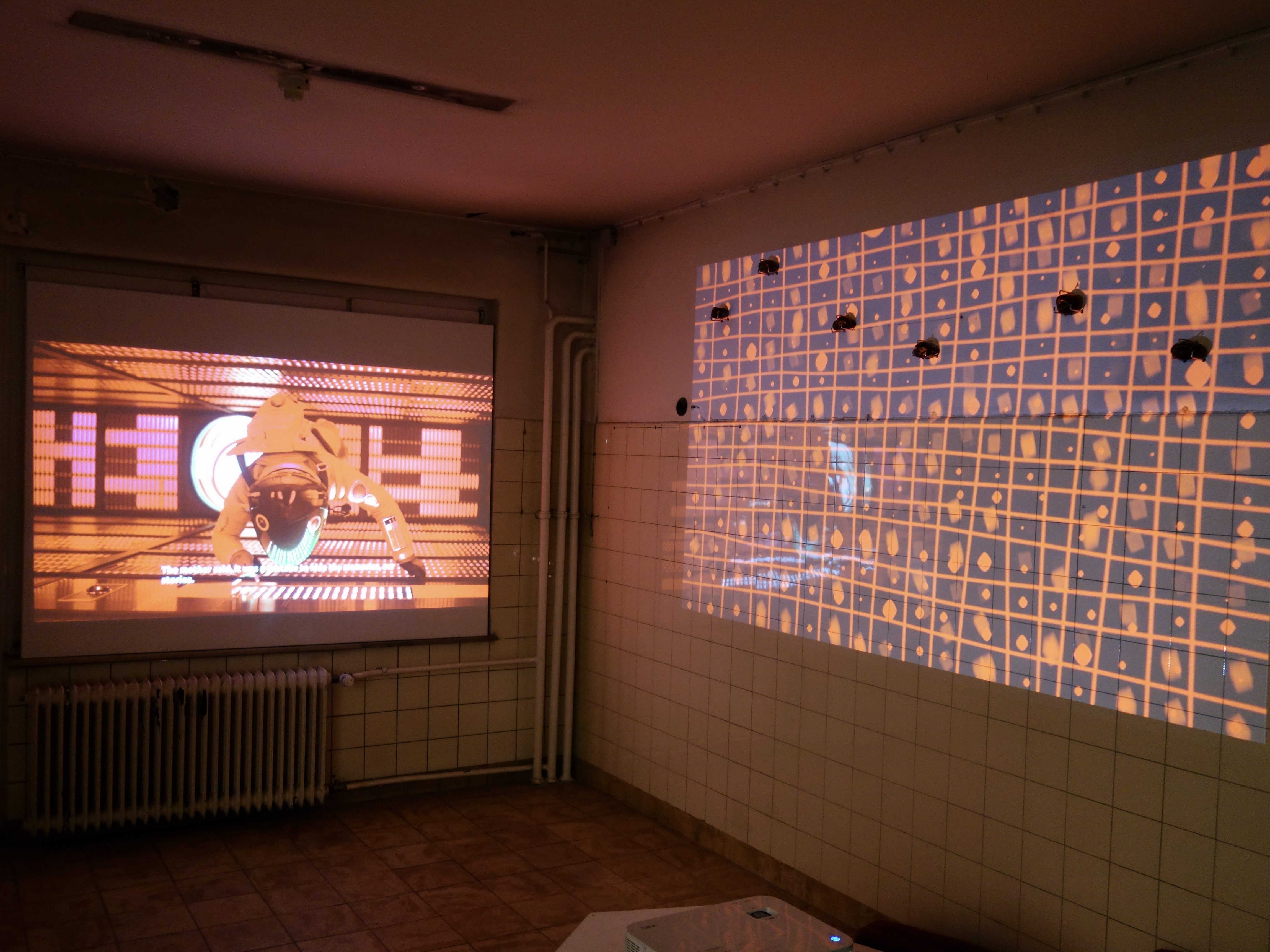The installation space invites visitors to explore, within the ruins of a former archive, the final memories of the last human whose name has been erased. The human identifies themselves as “One.” The video shown in the installation is an archival document from the Ministry of Artificial Truth, depicting the fragmented and distorted memories of the last human living in the year 2666. The video is divided into five parts: the weather forecast, news about cats, biological study, memories of the mother, and the phone call. Through a collage of film material from classic science fiction films, news broadcasts, and memes, it constructs a dystopian vision of the future under the totalitarian rule of artificial intelligence.