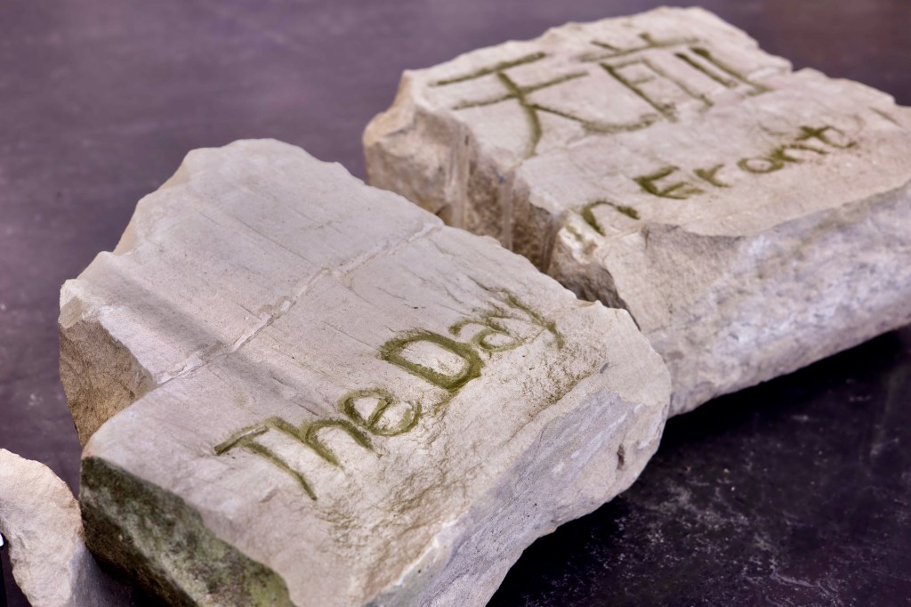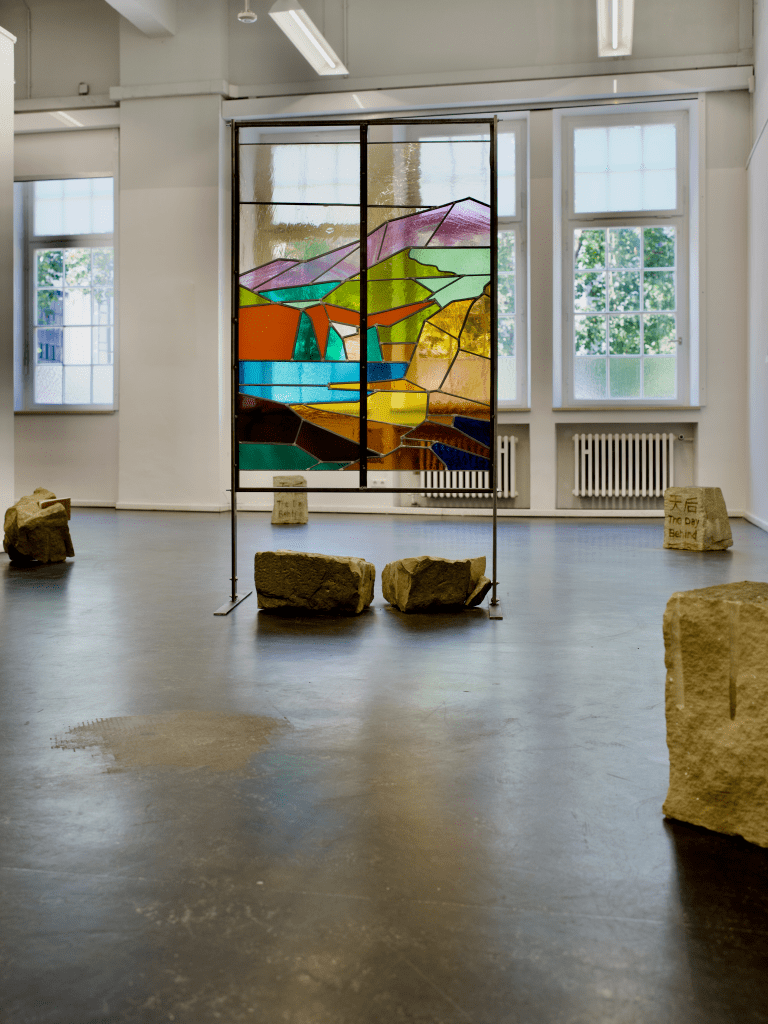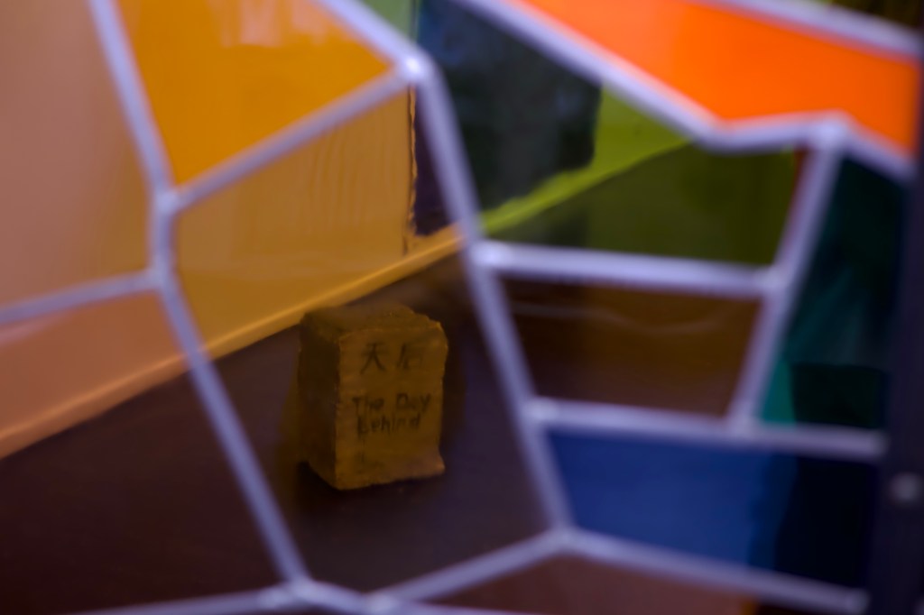 I constructed a time field using boundary markers made of sandstone. At the center, the past zone, represented by stained glass and a stone. Inscribed are the words “前天 The Day In Front.” Surrounding the past zone is the present zone, marked by four boundary stones, engraved with “后天 The Day Behind.” Beyond these markers lies the future field.