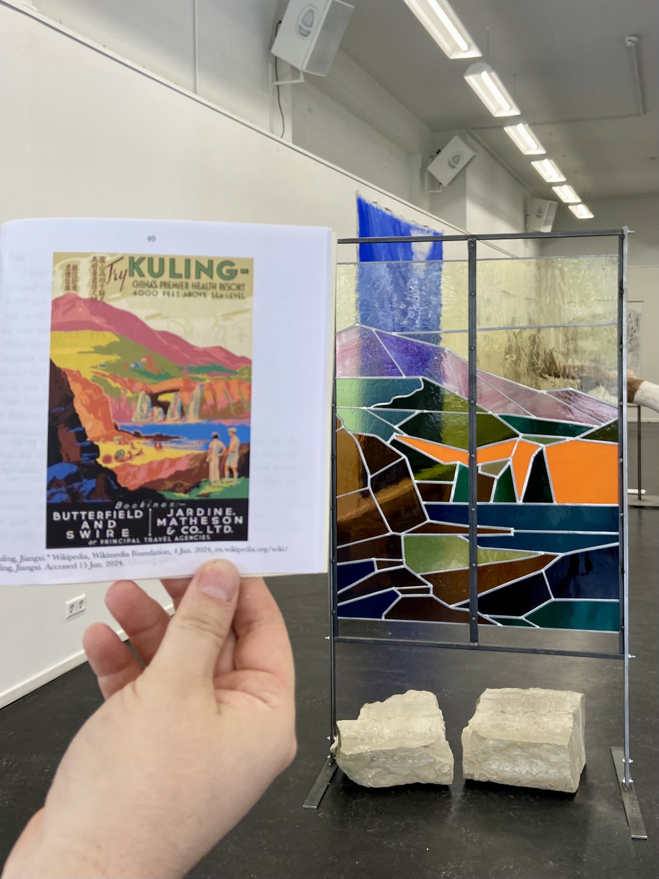 I have preserved his original narration but also created my own narrative of the Story of Kuling. Additionally, the pictures documenting the process of making the stained glass are positioned parallel to the map of Kuling during different periods.