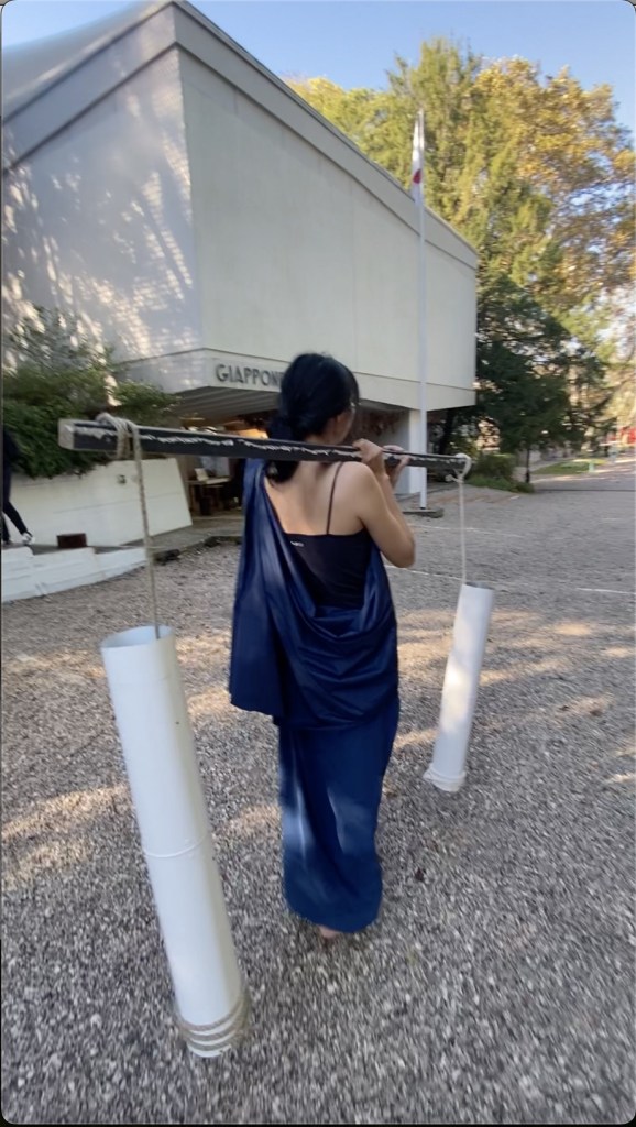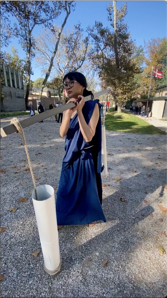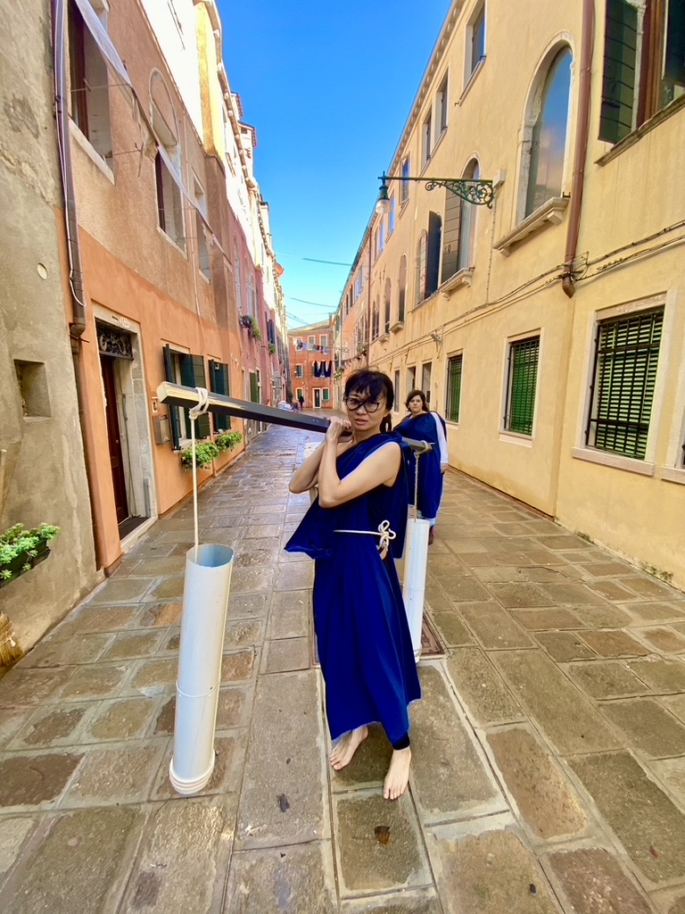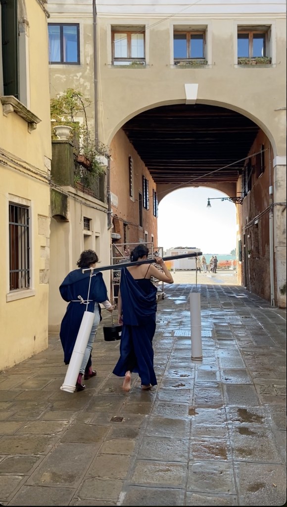“Unseal the Water” explores a speculative futuristic energy system derived from the abandoned Venetian cistern water system which shaped local communities and their everyday life. Inspired by the role of women as water carriers (Venetian Bigolante), different artistic methods were used (such as re-staging archival material, performative interventions, and narration) to initiate a ritual that unseals the water of the old Venetian cisterns. The objects used in this performance were fabricated with material remnants from the previous Art Biennale collected by the German Pavilion curatorial team.
